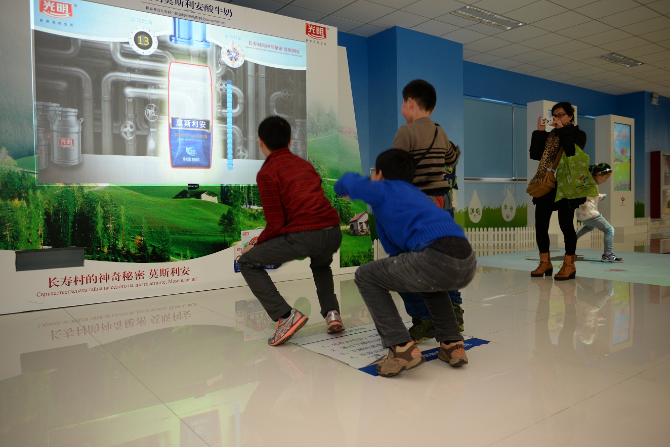 拍照結(jié)束后講解員帶領(lǐng)大家進入?yún)⒂^走廊,參觀過程中小朋友們都聽的津津有味??吹綁ι系氖止だL畫及牛奶知識,小朋友們感到興奮極了。當(dāng)然,最吸引小朋友們的還是最后的游戲互動區(qū)域,細(xì)菌大戰(zhàn)、深蹲、擠牛奶、動感單車、拼圖等等,小朋友們玩的不亦樂乎。 下午在多功能放映廳進行了互動問答活動,參與問答的小朋友都得到了相應(yīng)的禮品獎勵。