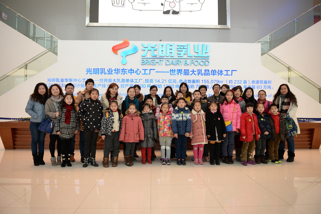 2月3日上午9點,活動第一天,18個參與活動的職工家庭在吳中路光明乳業(yè)總部集合,整裝待發(fā)。約十點鐘左右到達華東中心工廠。進廠后車子先繞廠一圈,由工作人員向小朋友們介紹工廠環(huán)境,在大致了解工廠情況之后小朋友和家長們下車到大廳集合并進行合影留念。