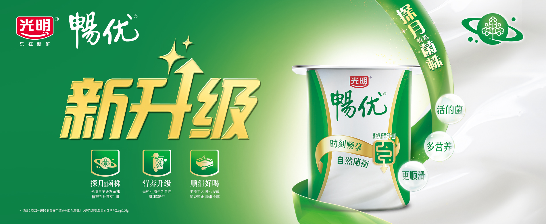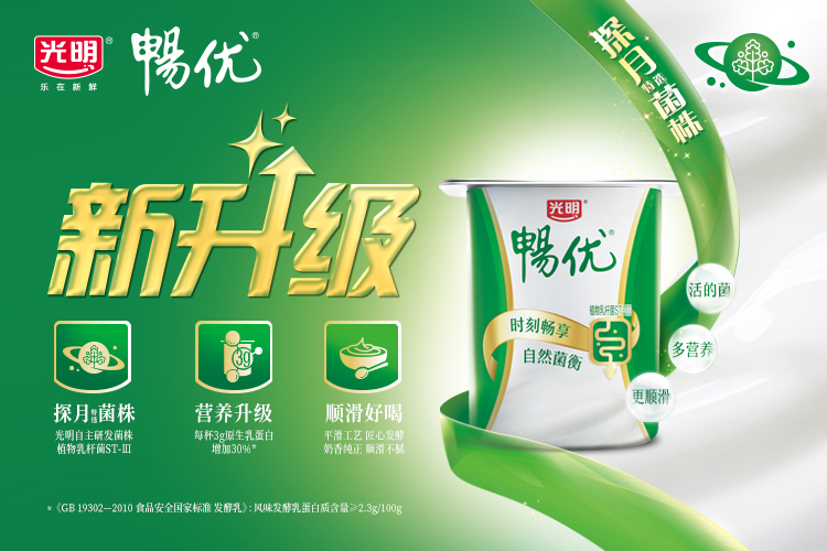 光明暢優(yōu)風(fēng)味發(fā)酵乳全新升級(jí),探月菌株植物乳桿菌ST-Ⅲ活性更強(qiáng),原生乳蛋白補(bǔ)充更多營(yíng)養(yǎng),奶香純正更順滑。